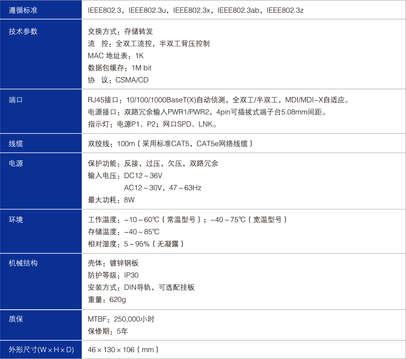 支持IEEE802.3,IEEE802.3u,IEEE802.3x,IEEE802.3ab,IEEE802.3z