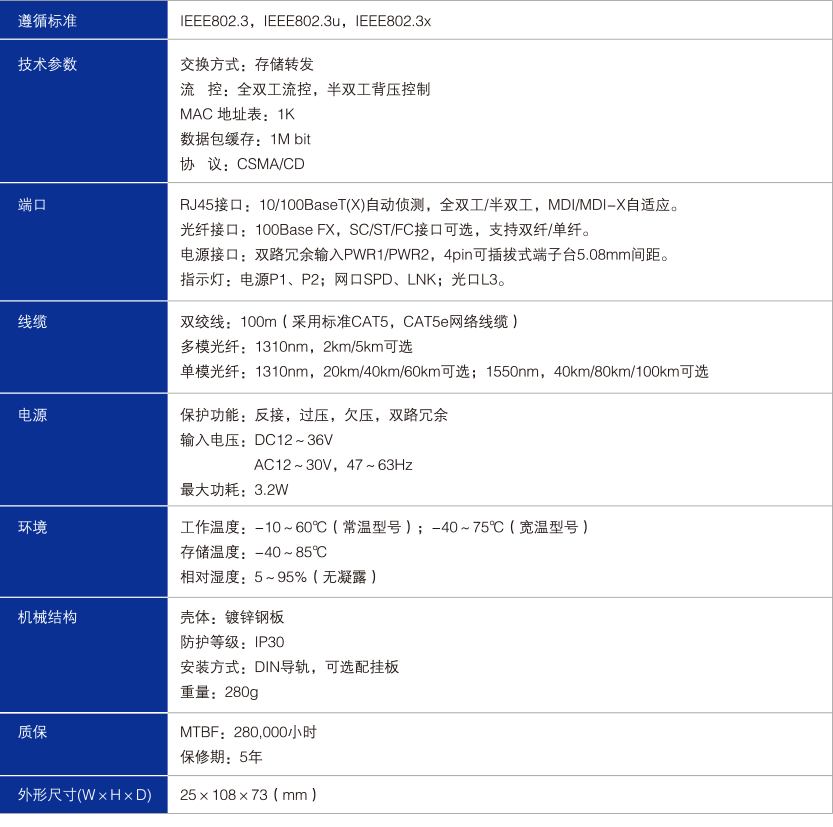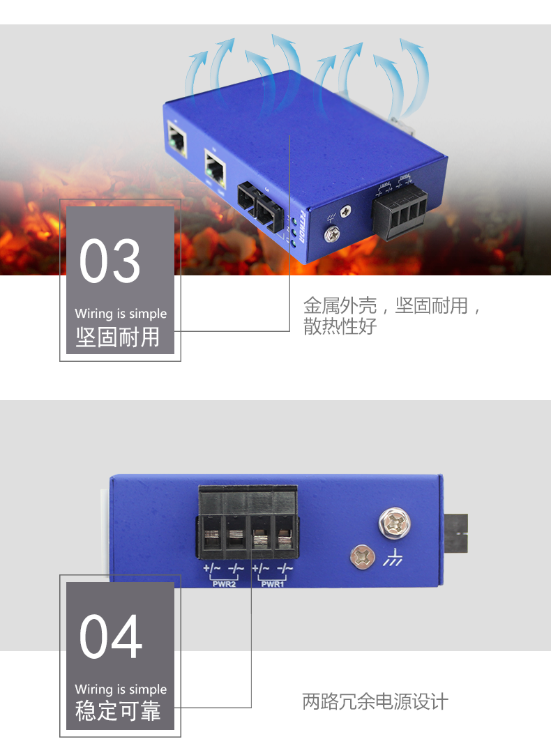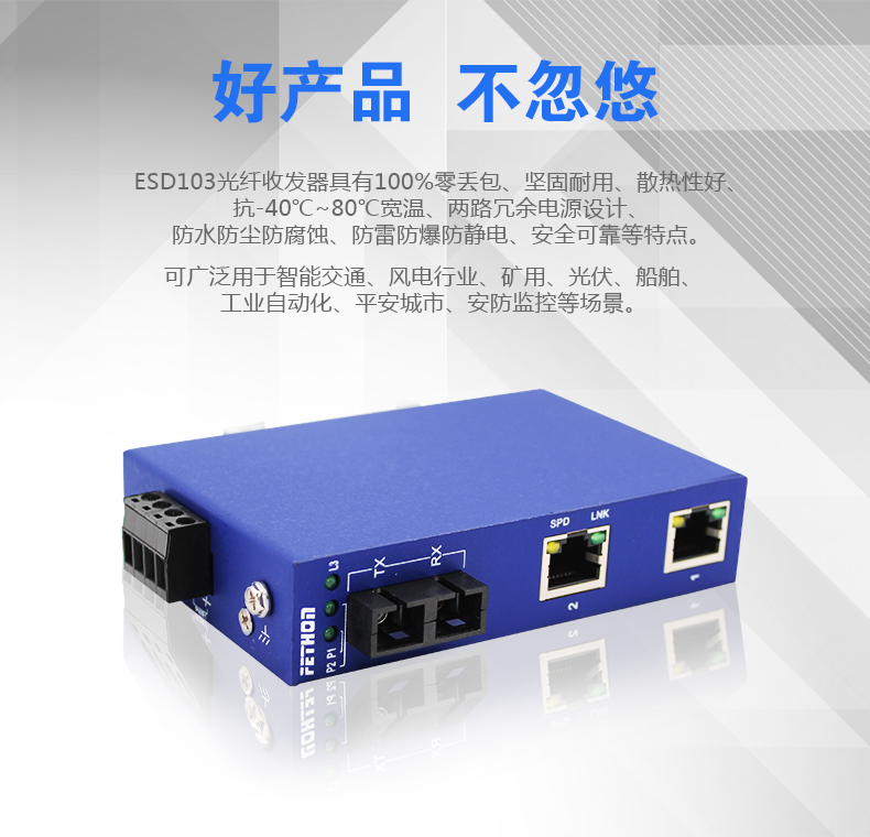 ESD103是一款1光2電dian工gong業ye級ji光guang纖xian收shou發fa器qi,殼ke體ti采cai用yong鍍du鋅xin鋼gang板ban,結jie構gou緊jin湊cou,支zhi持chi兩liang電dian口kou冗rong餘yu配pei置zhi及ji一yi個ge百bai兆zhao光guang纖xian端duan口kou。工gong業ye交jiao換huan機ji按an照zhao嚴yan格ge的de工gong業ye級ji標biao準zhun設she計ji,所suo有you器qi件jian均jun選xuan用yong工gong業ye級ji器qi件jian,具ju有you極ji高gao的de穩wen定ding性xing和he可ke靠kao性xing。DIN導軌安裝,可選配掛板,能夠滿足工業現場的需要。