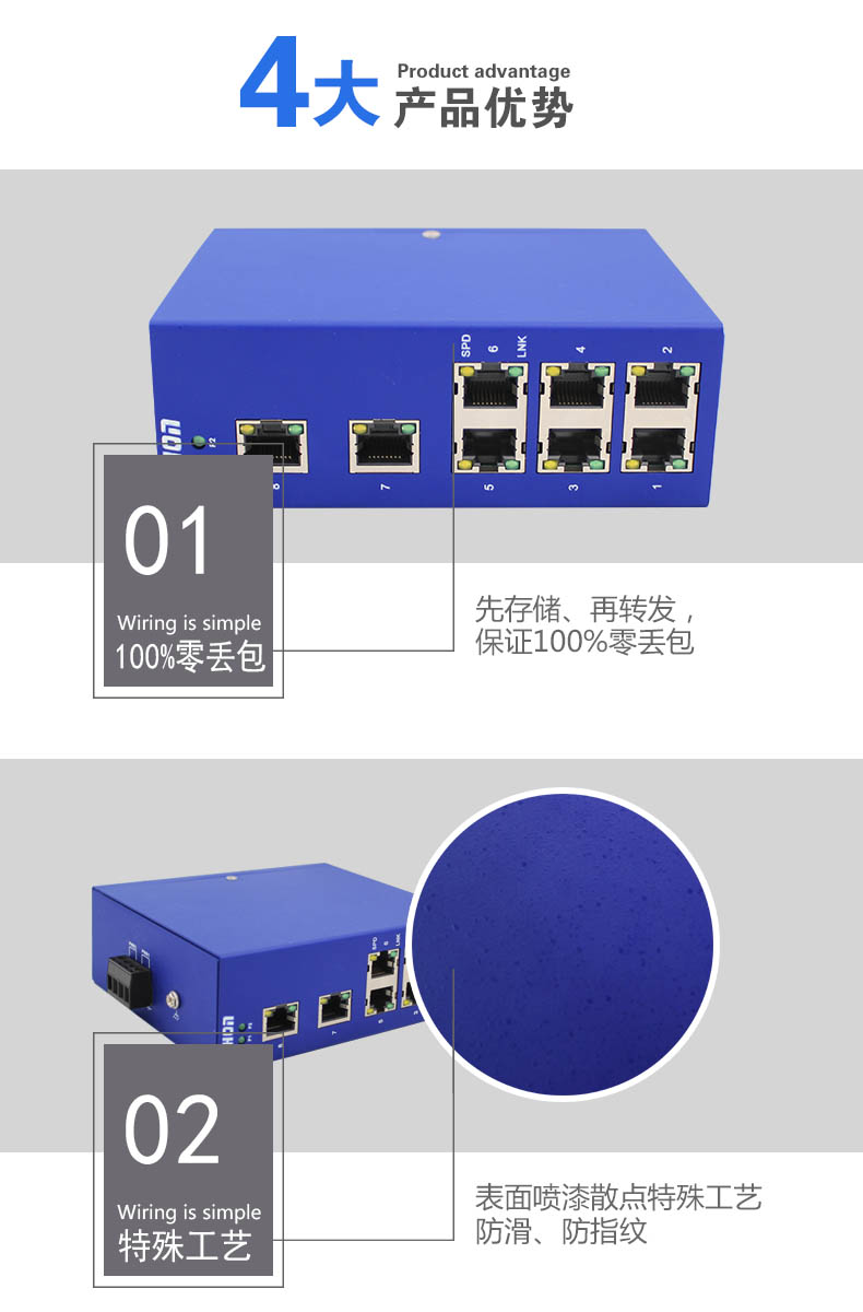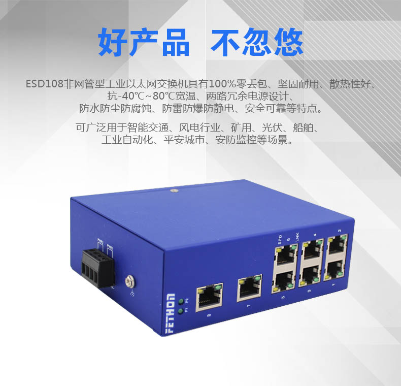 ESD108是一款8口(kou)百(bai)兆(zhao)非(fei)網(wang)管(guan)型(xing)工(gong)業(ye)以(yi)太(tai)網(wang)交(jiao)換(huan)機(ji),殼(ke)體(ti)采(cai)用(yong)鍍(du)鋅(xin)鋼(gang)板(ban),結(jie)構(gou)緊(jin)湊(cou),支(zhi)持(chi)八(ba)個(ge)百(bai)兆(zhao)端(duan)口(kou),可(ke)配(pei)置(zhi)一(yi)至(zhi)四(si)個(ge)百(bai)兆(zhao)光(guang)纖(xian)端(duan)口(kou)。兩(liang)路(lu)冗(rong)餘(yu)電(dian)源(yuan)設(she)計(ji),支(zhi)持(chi)4pin可插拔端子,交直流通用,同時提供電源防接保護及過壓、欠壓保護,極大提升產品工作的穩定性。以太網交換機所有器件按嚴苛的工業三級化標準認證,性能穩定,能夠適應惡劣的工業環境。-40℃~75℃的工作溫度範圍,在極端氣象條件下也能安全運行。