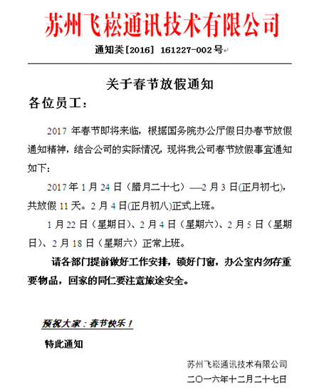 為迎接新年,蘇州飛崧工業交換機通知春節放假通知,自2017年1月24日(臘月二十七)至2月3日(正月初七),共放假11天。