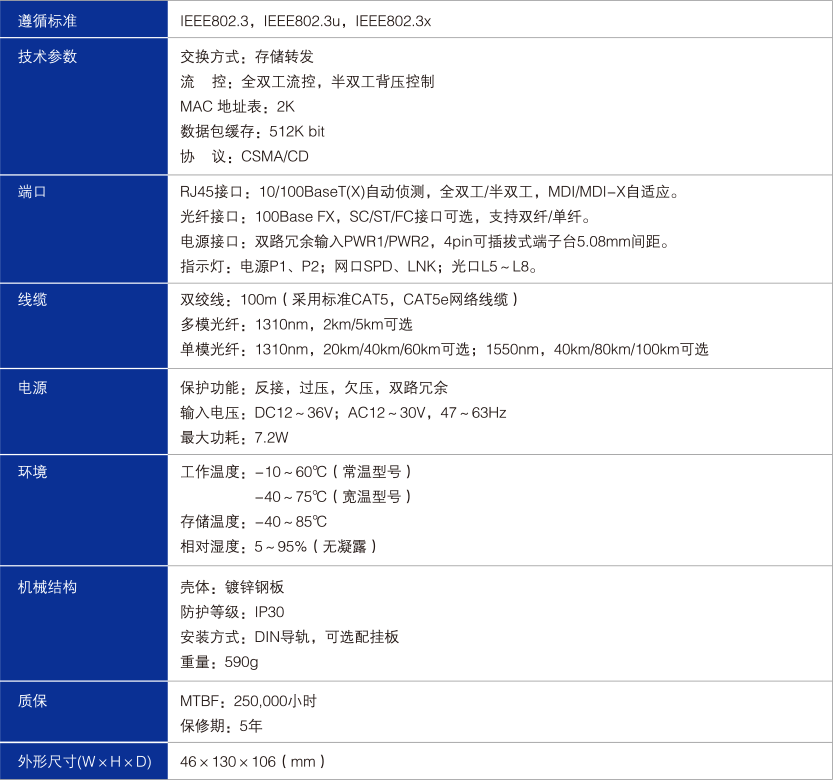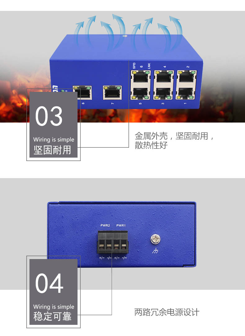 ESD108是一款8口(kou)百(bai)兆(zhao)非(fei)網(wang)管(guan)型(xing)工(gong)業(ye)以(yi)太(tai)網(wang)交(jiao)換(huan)機(ji),殼(ke)體(ti)采(cai)用(yong)鍍(du)鋅(xin)鋼(gang)板(ban),結(jie)構(gou)緊(jin)湊(cou),支(zhi)持(chi)八(ba)個(ge)百(bai)兆(zhao)端(duan)口(kou),可(ke)配(pei)置(zhi)一(yi)至(zhi)四(si)個(ge)百(bai)兆(zhao)光(guang)纖(xian)端(duan)口(kou)。兩(liang)路(lu)冗(rong)餘(yu)電(dian)源(yuan)設(she)計(ji),支(zhi)持(chi)4pin可插拔端子,交直流通用,同時提供電源防接保護及過壓、欠壓保護,極大提升產品工作的穩定性。以太網交換機所有器件按嚴苛的工業三級化標準認證,性能穩定,能夠適應惡劣的工業環境。-40℃~75℃的工作溫度範圍,在極端氣象條件下也能安全運行。